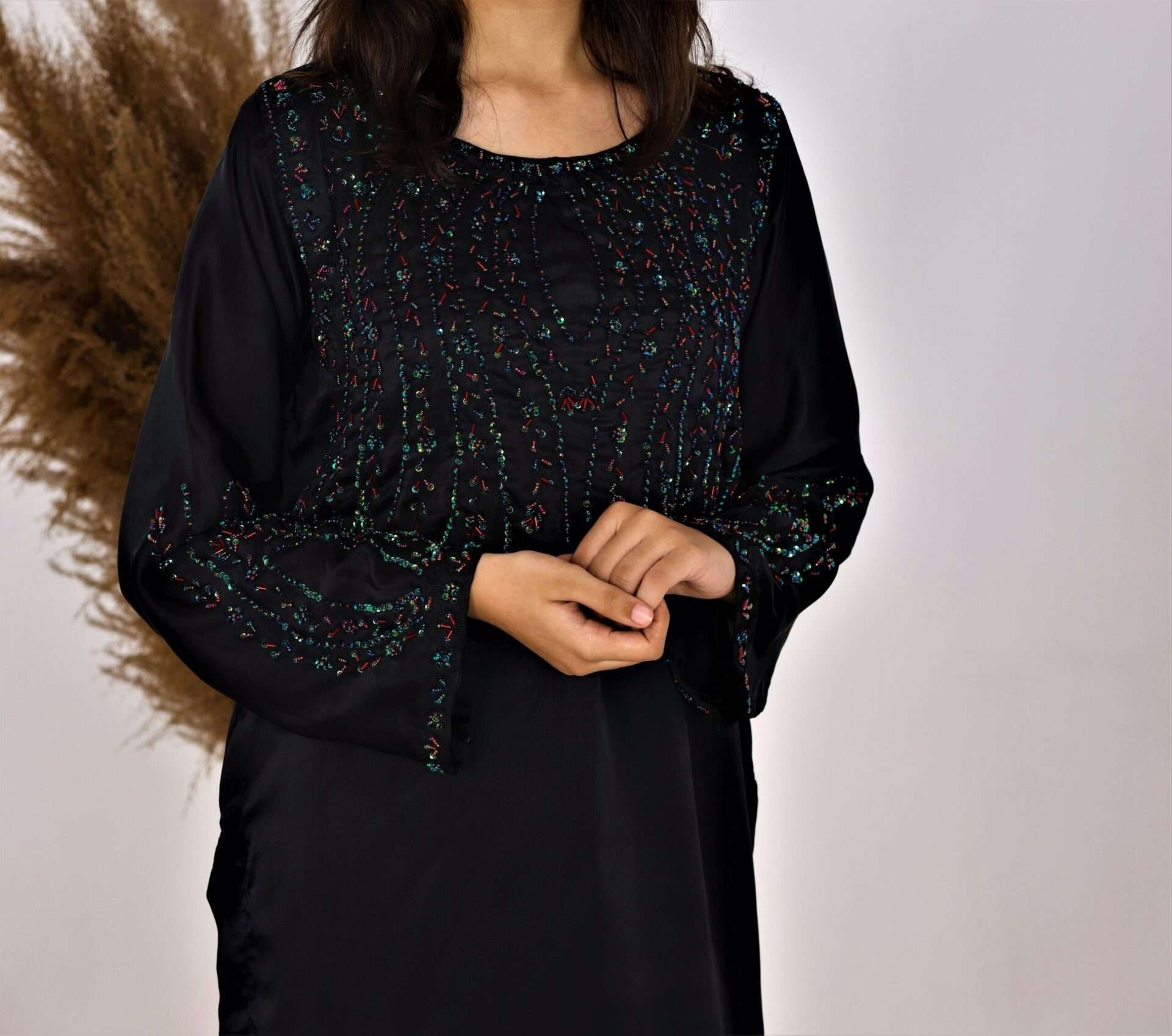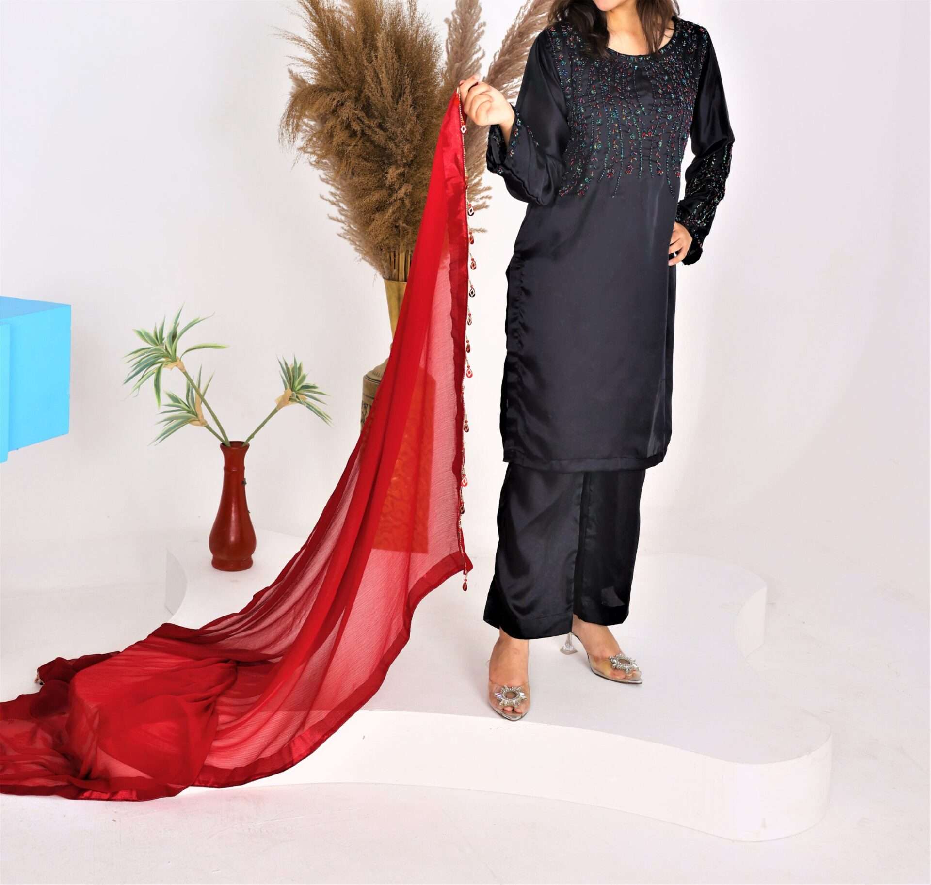 Step into timeless elegance with the Aafreen Silk Set, a captivating 3-piece ensemble that blends classic sophistication with bold contrast. Crafted from luxurious black silk, this outfit features a sleek silhouette paired with a striking red chiffon dupatta, creating a perfect harmony of grace and statement style.