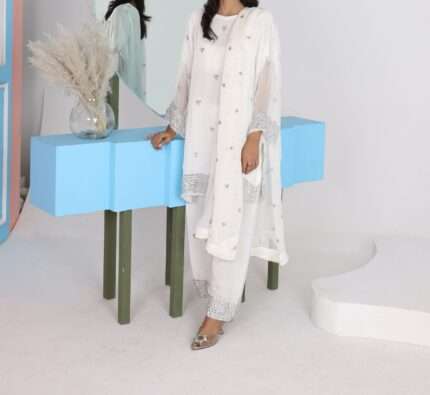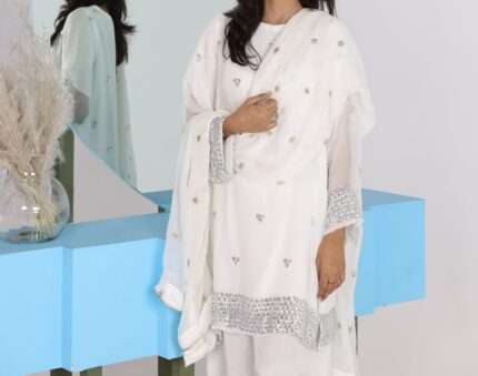 Crafted from premium-quality fabric, the Chandni outfit includes a beautifully embroidered shirt, matching trousers, and a delicate dupatta that adds a touch of ethereal elegance. The soft hues and refined craftsmanship make it an ideal choice for women who appreciate understated luxury.