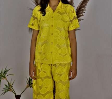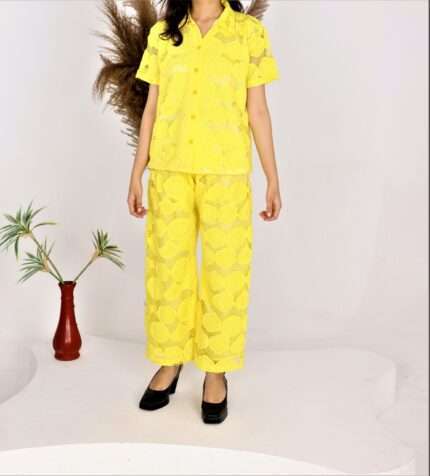 Available in three vibrant colors — Yellow, Red, and Purple — this co-ord set allows you to express your personal style while staying on trend. The flattering silhouette and easy-to-wear design make it a must-have addition to your wardrobe.