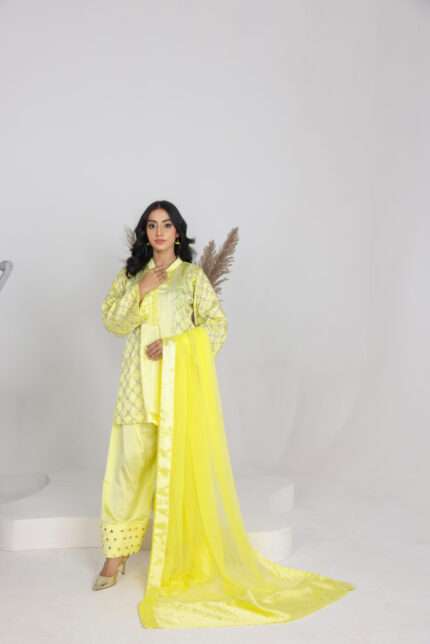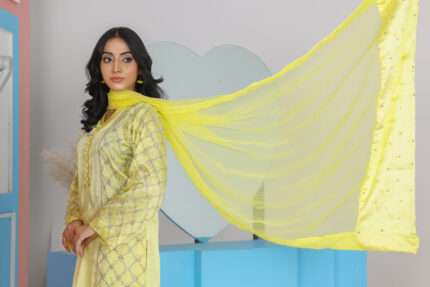 Brighten up any occasion with the Lime Zari Co-ord Set, a 3-piece ensemble that perfectly blends contemporary charm with traditional elegance. Crafted from premium fabric, this outfit features a beautifully embellished short kurta paired with coordinated trousers and a matching dupatta for a complete, polished look.