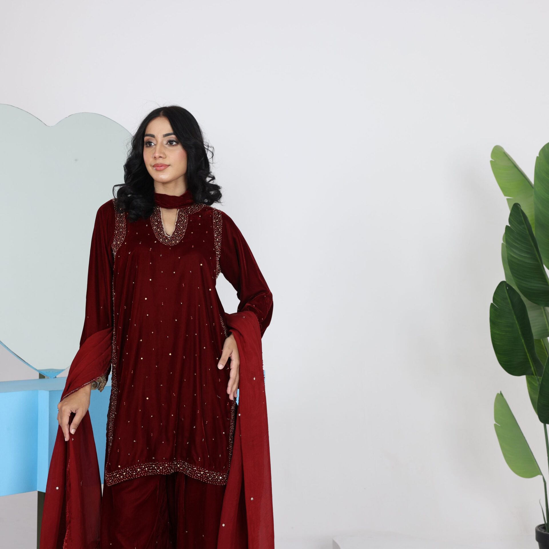 Voila Fine Velvet 3-Piece Suit with Embroidered Shawl